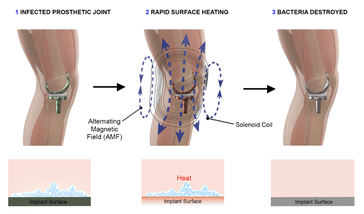 Alternating Magnetic Field (AMF) technology combats implant infections by generating a controlled thermal dose on metallic implants. This heat effectively kills bacteria and removes biofilm within a millimeter of the implant surface. AMF significantly reduces biofilm, making it easier for the immune system and antibiotics to clear the infection. Importantly, AMF achieves therapeutic temperatures comparable to other procedures, ensuring safety.