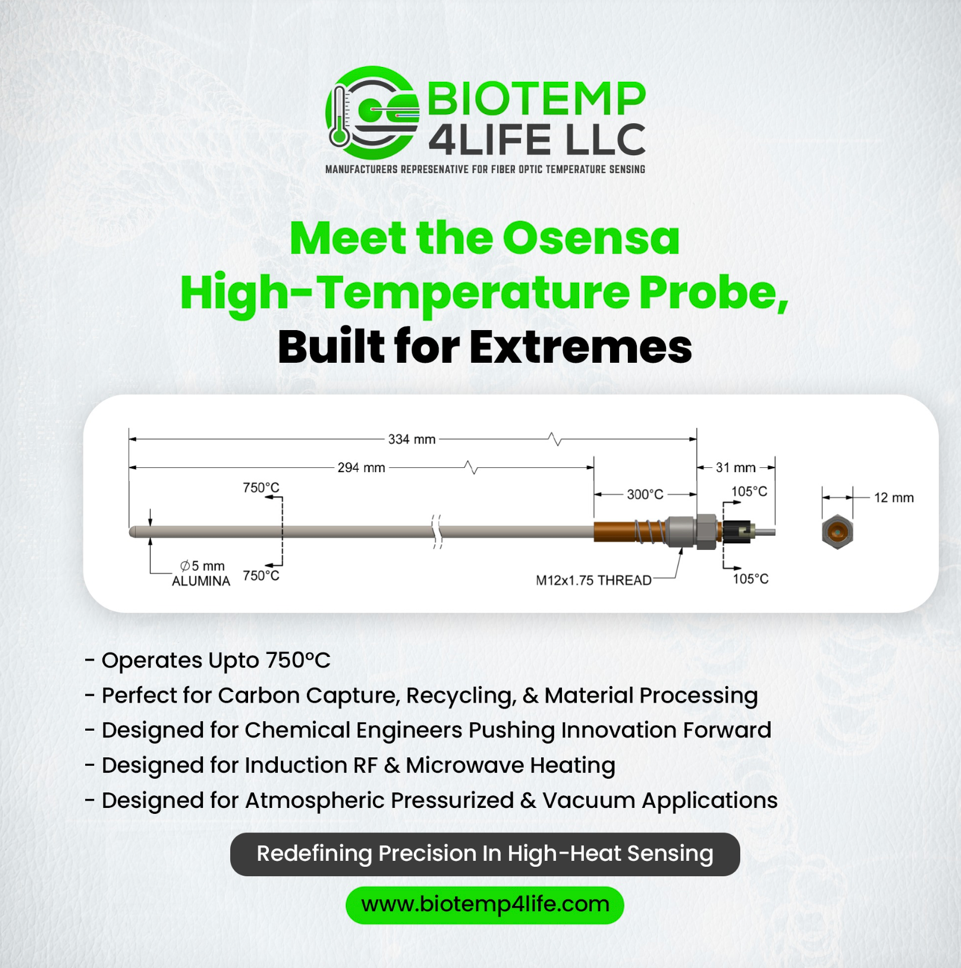 Osensa Innovations is a manufacturer of fiber optic probes and electronic systems designed for temperature measurement and control. The fiber optic temperature probes are used in many industrial applications involving AC, RF and MW fields for heating, drying and process applications. The fiber Optic probes are immune to these fields and work up to 750 °C. The electronics can provide a digital output, or a 4-20 milliamp analog output used for input to temperature controllers, programmable logic controllers or heating units. The fiber Optic Temperature probes come in a variety of versions designed for these applications. The fiber optic probes are designed for both lab, batch processing and continuous belt oven processing.