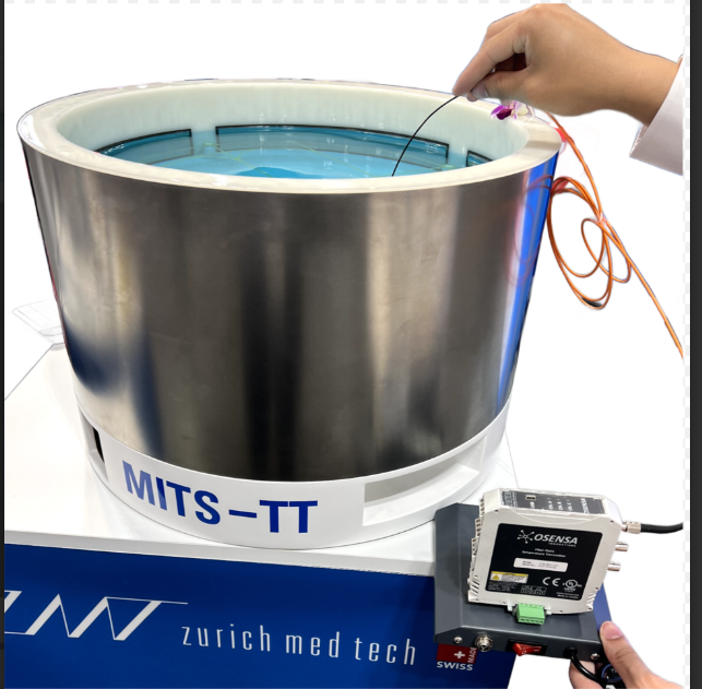 The Osensa probes can be used with standard MRI machines or Medical Implant Test Systems from companies such as Zurich Med Tech for RF Safety. These systems use RF Coils to simulate the pulsed RF fields that an MRI machine can produce. The RF fields from the medical implant systems heat implants, and the Osensa probes can measure the temperature. The Osensa probes can measure the slightest changes in temperature with 0.01 °C Resolution and 0.1 °C Accuracy. The probes are used in Tissue Simulation Media, which companies like Zurich Med Tech often supply. (https://zmt.swiss/validation-hw/tsm/)