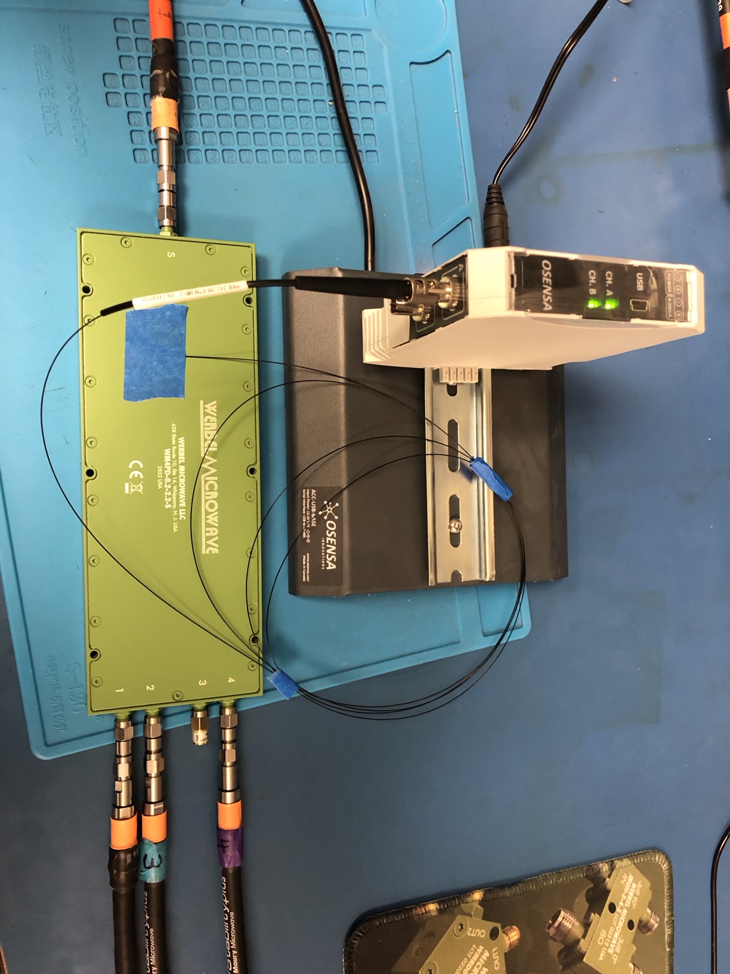 RF and Microwave High power Components need to be tested to make sure the components are within safe operating limits and to make reliability predictions. The Osensa system shown here is usually used to measure case temperature and component temperature inside. Conventional temperature with metal sensors were heating up from the strong RF and Microwave fields so Fiber Optic Probes are used which are immune to these electromagnetic fields. Different dielectrics in these components respond differently to each field and heating is controlled by power level, duration and the field.